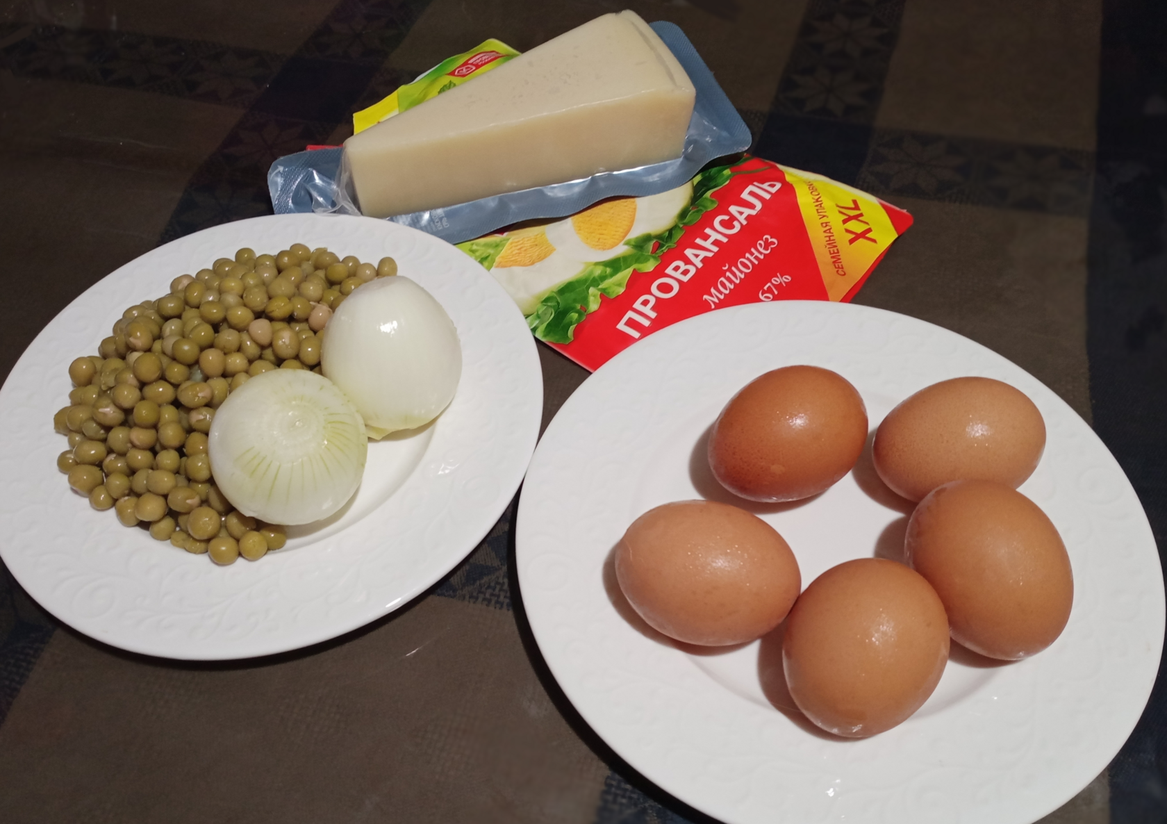 Нам понадобятся: Яйца - 3-4 шт. (у меня пять, я готовил побольше) Лук - 1 шт. (у меня две маленькие луковички) Зелёный горошек - 200 гр. Сыр - 150 гр. Майонез.