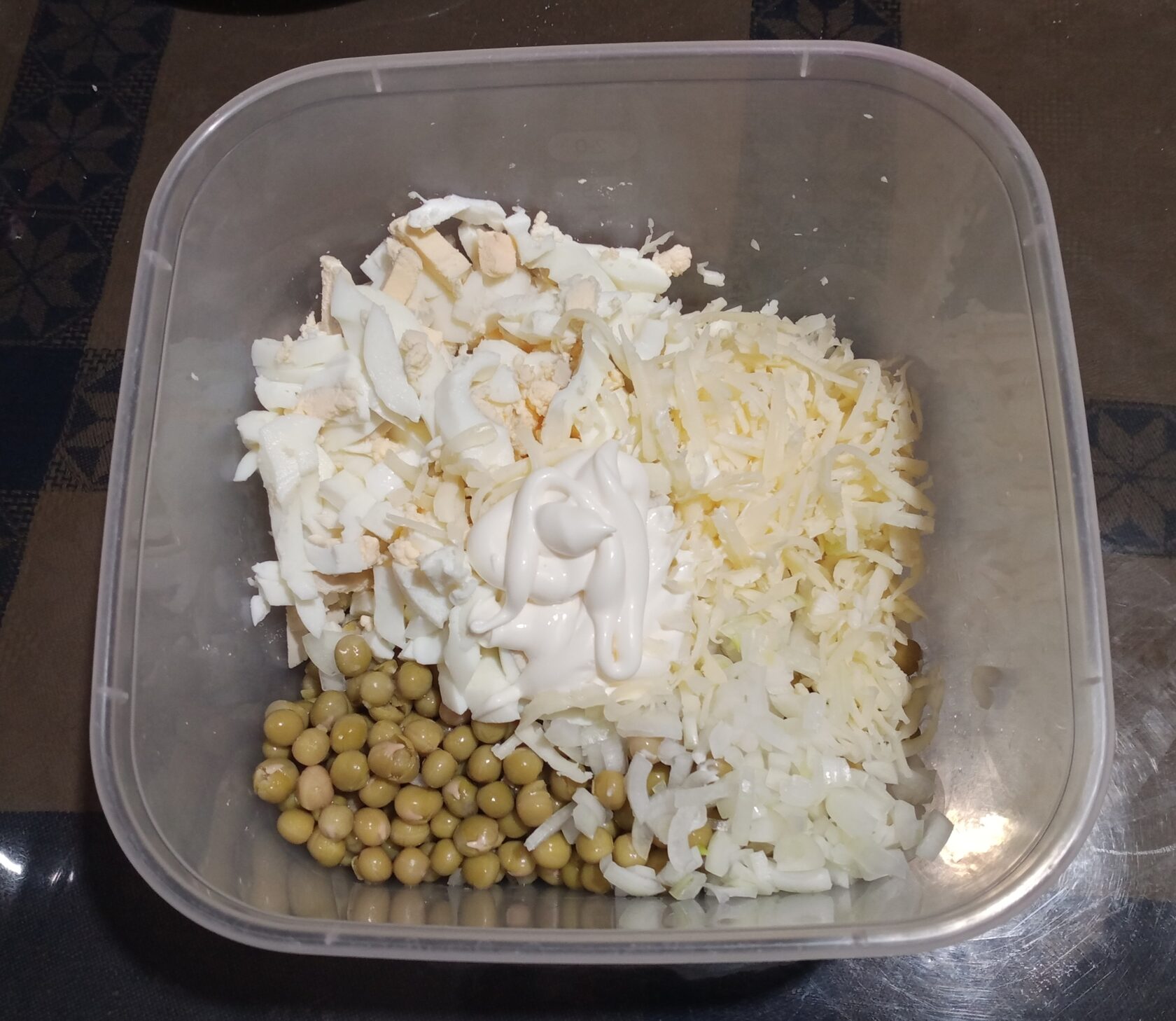 Не переживайте, помощника угостили, но не сыром, ему нельзя. Теперь складываем все продукты в посуду, которая для вас удобна и добавляем майонез (за кадром мы освободили горох из банки и слили маринад)