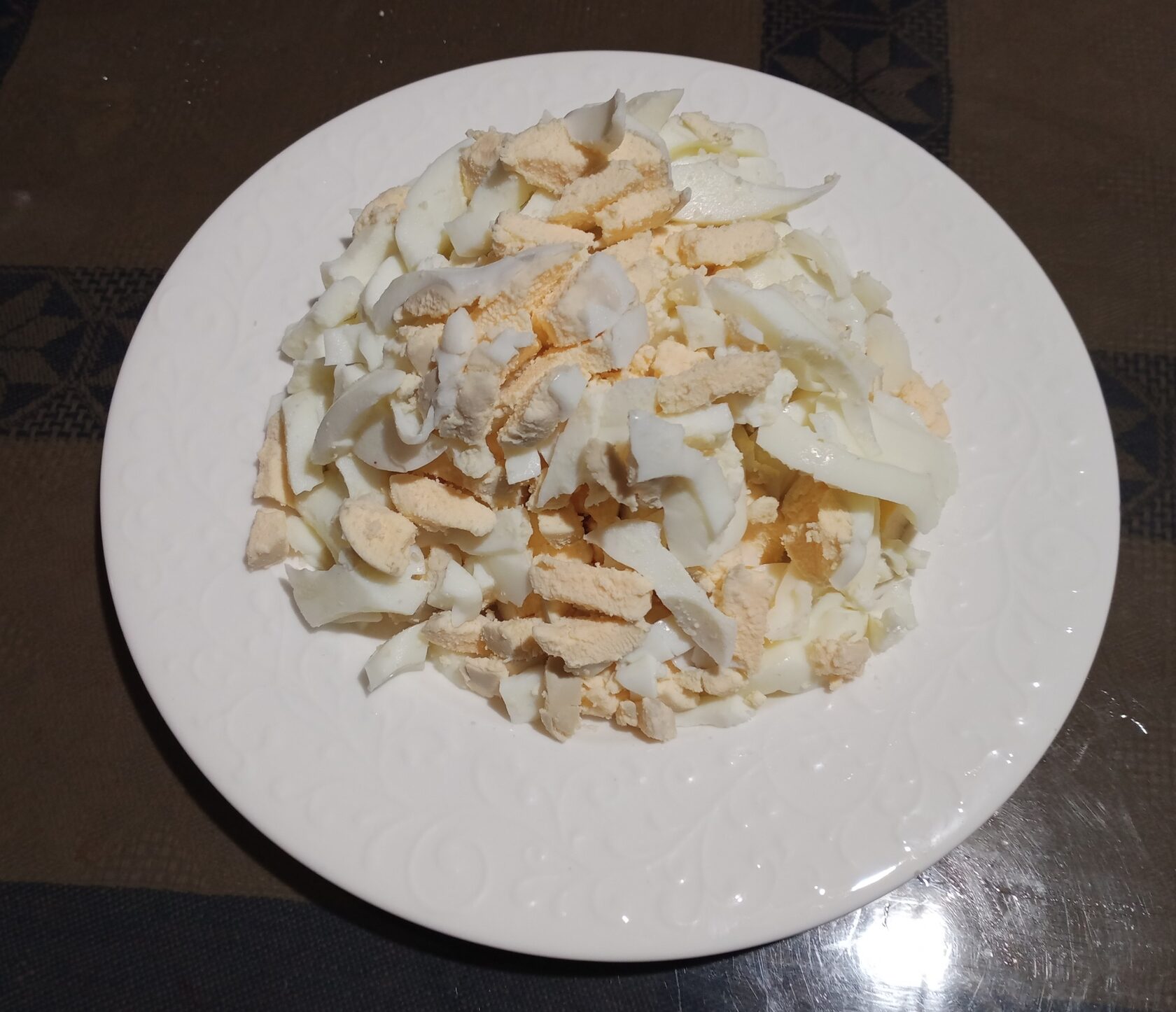 Яйца варим, очищаем, и нарезаем кубиком.